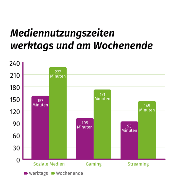 - Gaming: Der Konsum von Videospielen liegt werktags bei 105 Minuten, an Wochenenden steigt er auf 171 Minuten.